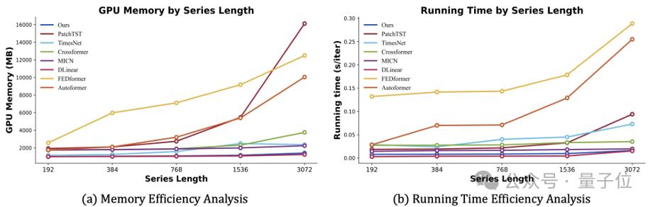 模型效率:团队将训练阶段的运行内存和时间与最新最先进的模型进行比较,其中 TimeMixer 在 GPU 内存和运行时间方面,对于各种系列长度(范围从 192 到 3072)始终表现出良好的效率),此外还具有长期和短期预测任务一致的最先进性能。
