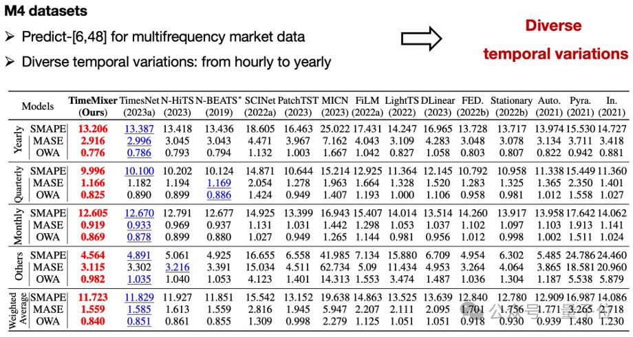 泛化能力:在多个不同类型的数据集上进行测试,TimeMixer均表现出良好的泛化能力,能够适应不同的数据分布和特征。这表明TimeMixer在实际应用中具有广泛的适用性。