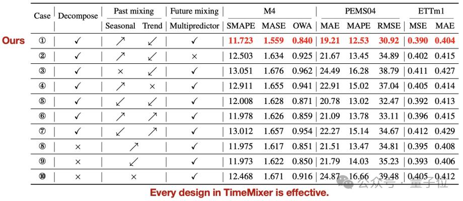 消融实验:为了验证 TimeMixer 每个组件的有效性,我们在所有 18 个实验基准上对 Past-Decomposable-Mishing 和 Future-Multipredictor-Mishing 模块中的每种可能的设计进行了详细的消融研究。