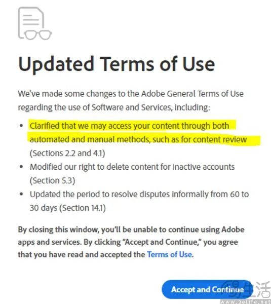 在全新的隐私条款中Adobe声称,“我们有可能以自动或人工方式访问你(创作)的内容,并且可以免费访问受保密协议保护的作品”。此外,如果用户不同意新的条款,该公司将把用户锁定在其服务和应用程序之外。这也就意味着,除非同意新的条款,否则用户将被限制使用相关服务。