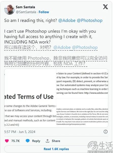 Adobe的这番操作可谓是一石激起了千层浪,因为新的条款不仅意味着用户基于Adobe软件创造的内容可能会被用于训练AI或是进行内容审查,甚至Adobe还能穿透设计师与客户之间的保密条款。以至于大量的设计师、导演、艺术家在社交平台公开呼吁抵制Adobe,面对用户的指责Adobe就坐不住了。