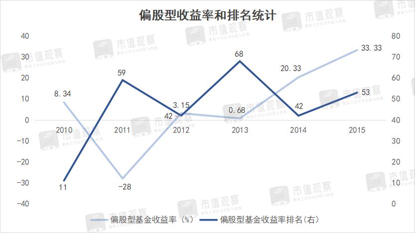 2013年,大成基金的偏股型基金收益率仅为0.68%,排名已经降到行业第68名。即便在2015年牛市行情中,收益率也只在33%,排在行业第53名。