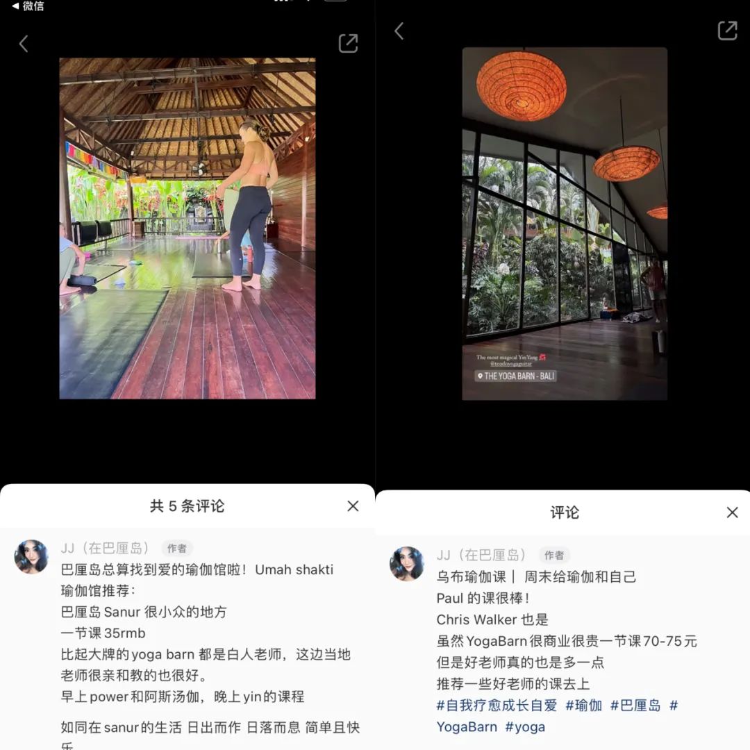 来源: JJ在小红书分享的不同瑜伽馆打卡体验 @JJ(在巴厘岛)
