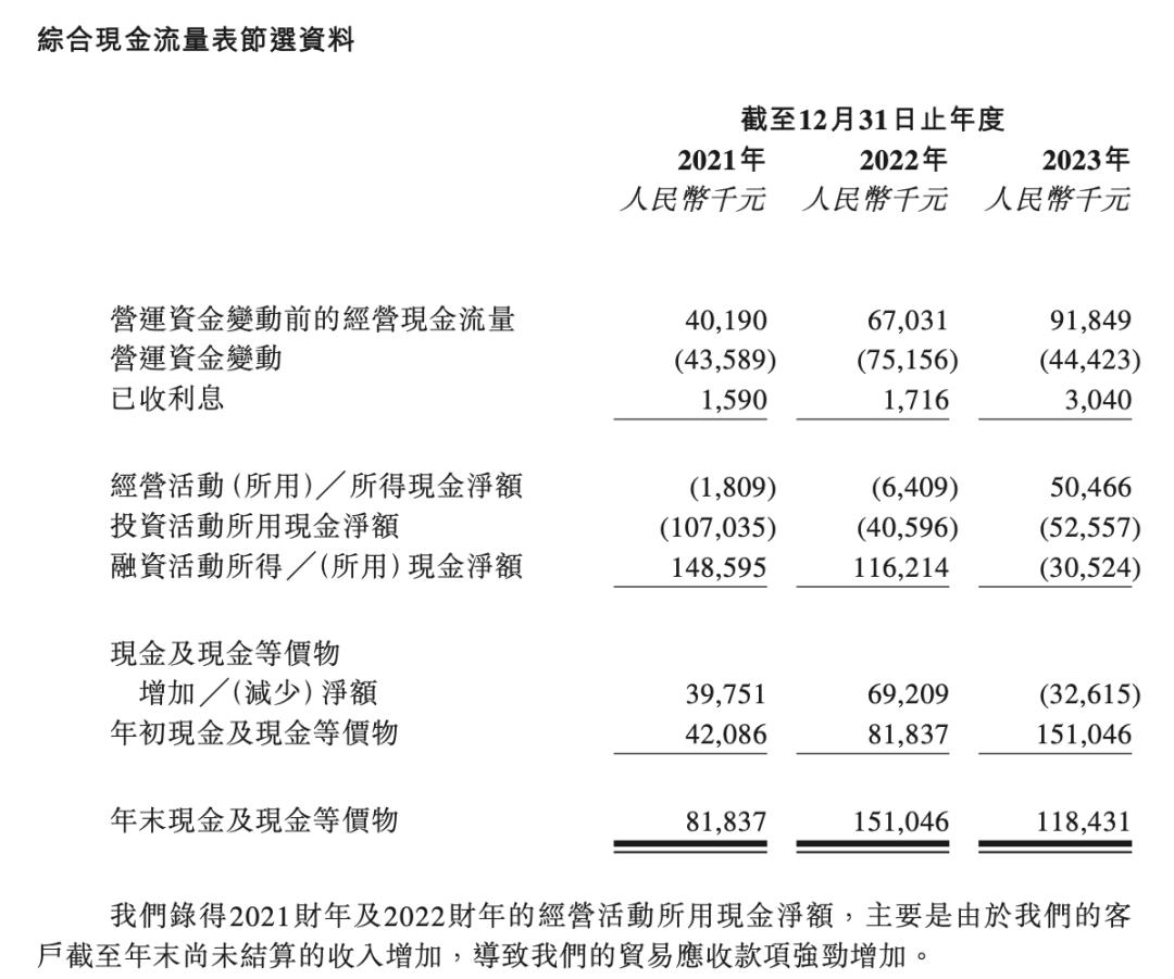赛目科技表示,由于应收款项的增长,2021年和2022年公司经营活动产生大量现金流出,分别为180万元和640万元。随着其客户回款,2023年公司经营活动所得现金净额为5046万元。