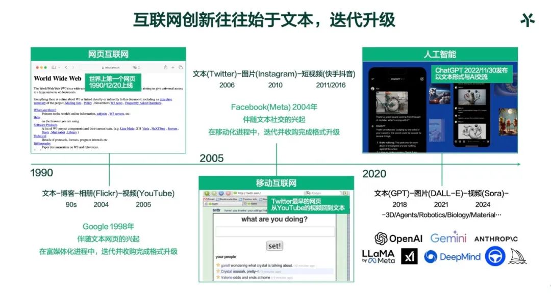 今天的AI依然回归到文本为起点,从最初版本的ChatGPT、到DaLL-E/Midjourney、到Sora。无论是Google的搜索,还是Facebook的分享,文本始终是连接用户和创造价值的关键。互联网创新并不连续,往往会回到文本为起点。文本的重要性可能被低估,周期可能会很持久。把握住格式升级浪潮的创新公司,有机会成为大趋势中的未来赢家。