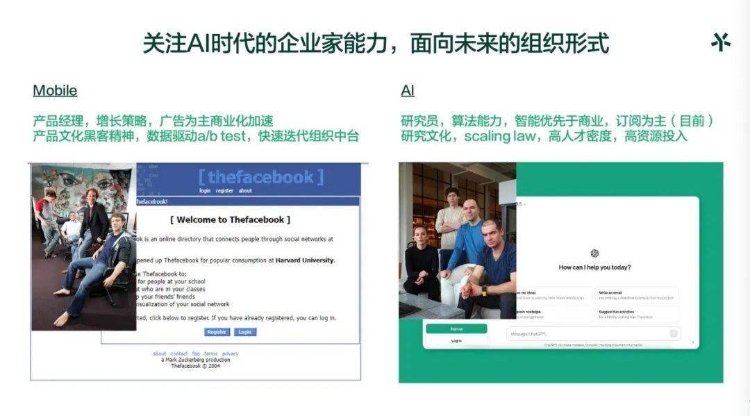 基于上一个周期成功的企业家画像、组织形态、商业路径进行线性推演,可能会成为一种陷阱。正如Mobile时期诞生的公司与PC互联网时期很不一样,AI时代的公司可能会与Mobile时期截然不同,我们需要全新的视角来理解新周期的企业家,并支持他们对未来的积极投资。