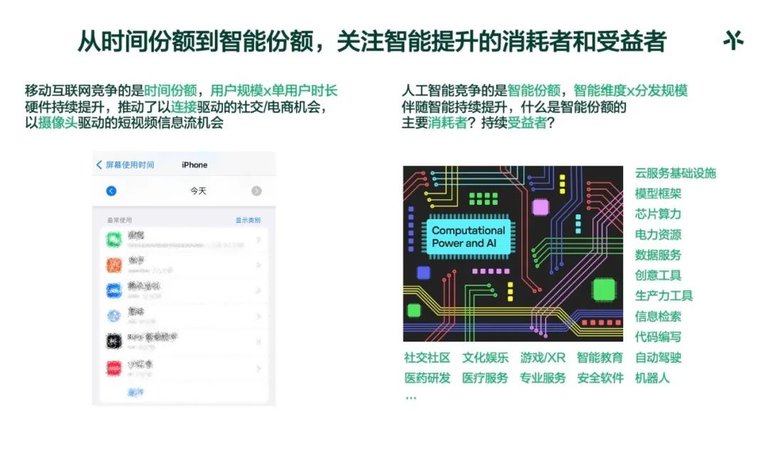 在AI时代,用户的人均使用时长进一步增长的空间有限,而智能的提升潜力巨大。 未来能拥有更多智能份额的公司,更有机会在基础设施持续完善、算力成本持续下降、模型能力持续提升的趋势中持续受益。