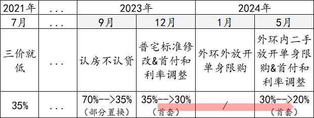 这之间首付比例变化最大的就是去年9月的认房不认贷,其中置换唯一住房以及上海无房但有贷款记录的购房人首付比例从70%降到35%。