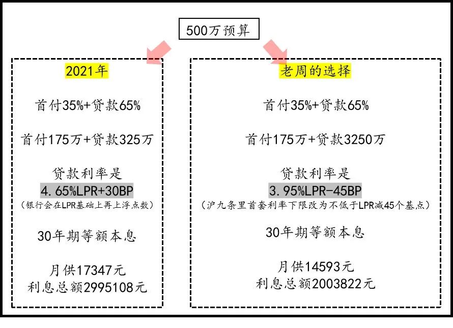 老周的老婆算了下,等于他们推迟三年上车,同样的首付款,利息反而省了99万。
