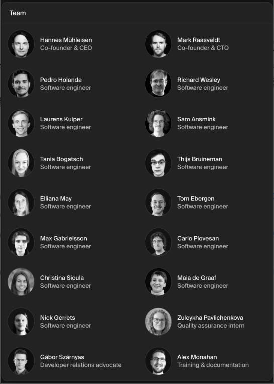 有报道称,DuckDB Labs 公司 CTO Mark 是最主力的程序员,50% 的代码是他一人完成,另外还有 13 个程序员,1 个测试实习生,1 个人负责开发者生态,1 个人负责培训与文档。