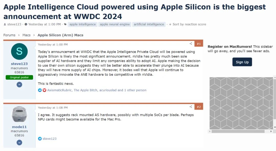 这一点在国外科技论坛上引发了“科技发烧友”的热议。有网友发帖称,“苹果智能私有云将使用苹果芯片作为动力,这可能是最重要的宣布。英伟达几乎是AI硬件的唯一供应商,他们限制任何公司采用AI的能力。苹果决定使用自己的芯片表明,他们将能够更好地加速投入AI,因为他们将有更多的AI芯片供应。这也预示着苹果将继续积极创新硬件,以便与英伟达竞争。”