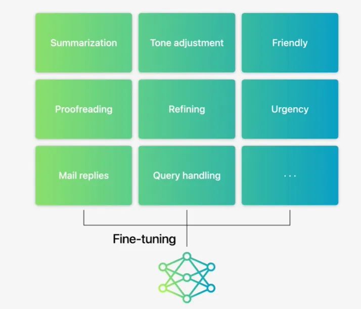 第一层是苹果的本地模型,这部分包含语言模型和扩散模型。语言模型是参数仅为3B的小模型,能够在iPhone这类小型终端上使用,并能提供较好的性能。该模型针对一系列任务微调过,例如编写和完善文本、确定通知的优先级和摘要、为与家人和朋友的对话创建有趣的图像以及采取应用内操作以简化跨应用交互等。在这些微调模型权重之上有个适配器,可以根据任务来选择最合适的权重。