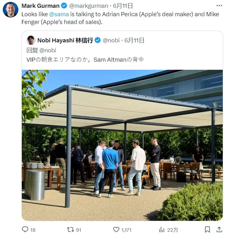 外媒科技记者古尔曼转发一张阿尔特曼在苹果总部的照片 图片来源:X平台