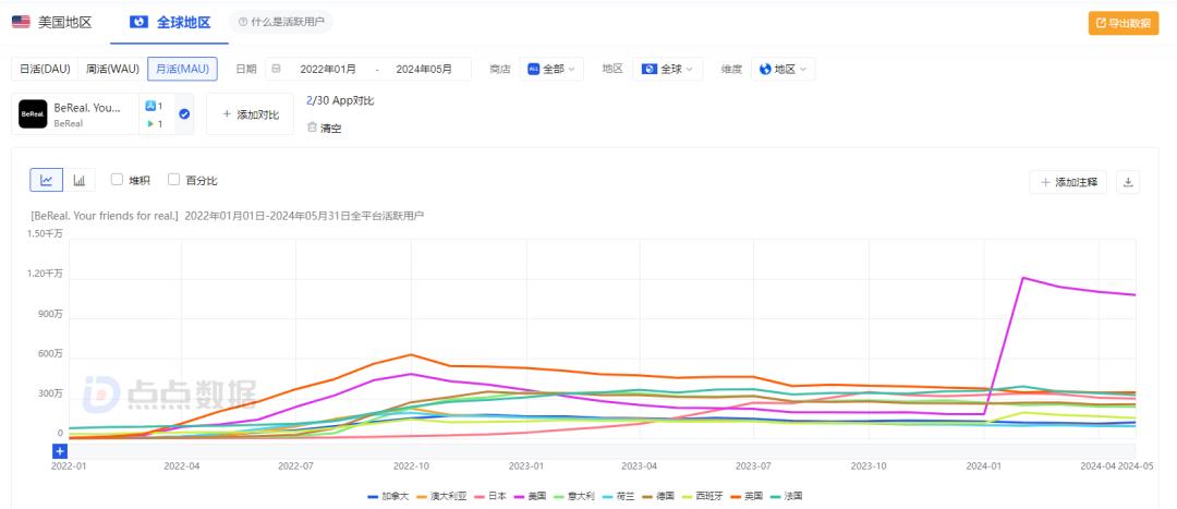 BeReal全球市场月活用户 | 图源:点点数据