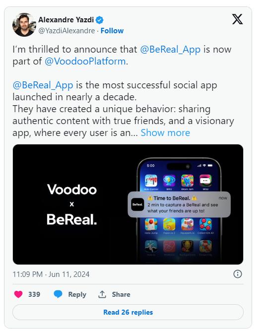 6 月 11 日,也就是昨天,Voodoo 的 CEO Alexandre Yazdi 自己发推宣布了并购消息,编辑部的同事看到消息的统一疑惑在于竟然是 Voodoo 收了 BeReal、而且还花了那么多钱。