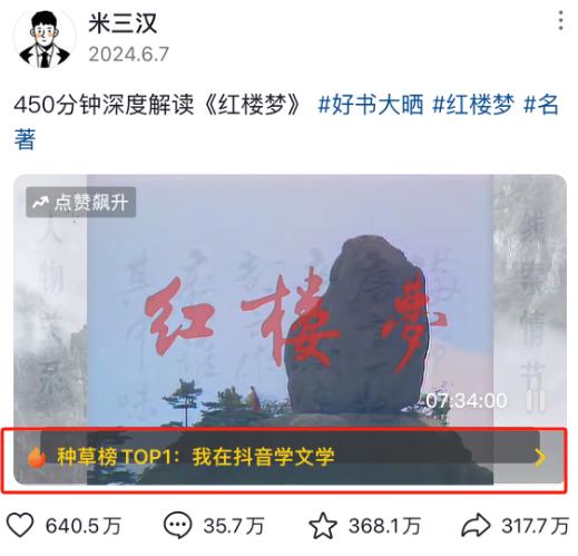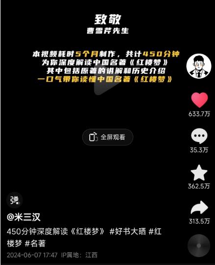 抖音平台上,一位 IP 显示江西的博主@米三汉 ,在 6 月 7 日这天,发布了一条 “ 一口气看《红楼梦》 ” 的视频。