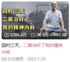 我立马想到视频博主@衣戈猜想,两年前他发布的 “ 回村三天,二舅治好了我的精神内耗 ” 视频,单 B 站一个平台,就收获了超 5000 万的播放量。