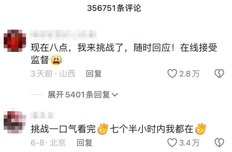 部分网友直接在评论区发起挑战,“ 挑战一口气看完 ” 的相关评论大有人在。