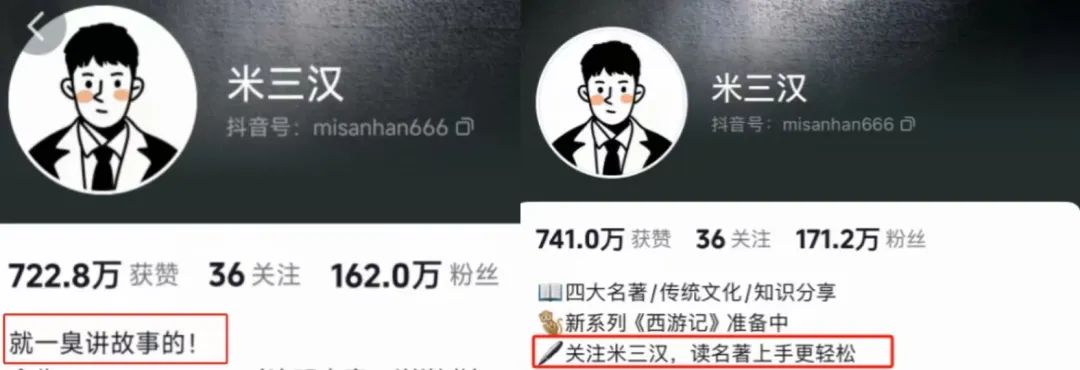 按米三汉自己的介绍,从之前的 “ 就一臭讲故事的 ” 到现在的 “ 关注米三汉,读名著上手更轻松 ” ,他也是知识分享类博主。