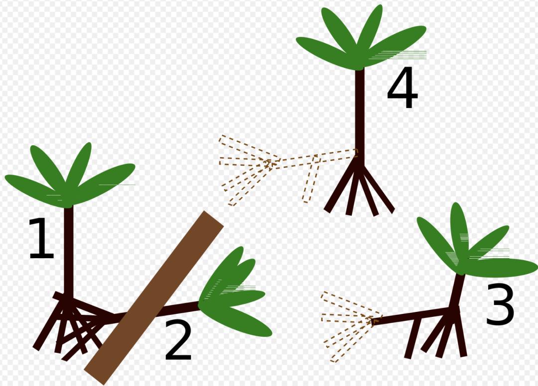 Bodley的理论是,当一棵棕榈树被压到后,它可能会按照图示的顺序长出根,看起来就像是“移动”了|Wiki