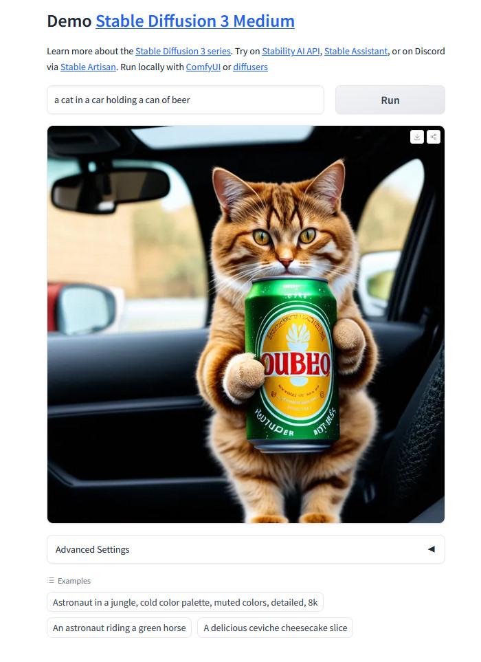 使用“一只猫在车里抱着一罐啤酒”作为提示词,在 SD3 Medium 中生成的示例