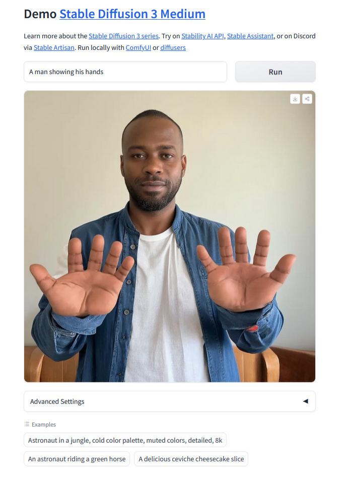 使用 Hugging Face 上的 SD3 免费在线演示,即可快速输入提示词并看到与 Reddit 用户们上报情况类似的结果。例如,使用“一名男子伸出双手”的提示词,模型生成了一张男子举起两只硕大且左右颠倒手部的图像,好在指头倒是正确的五根。