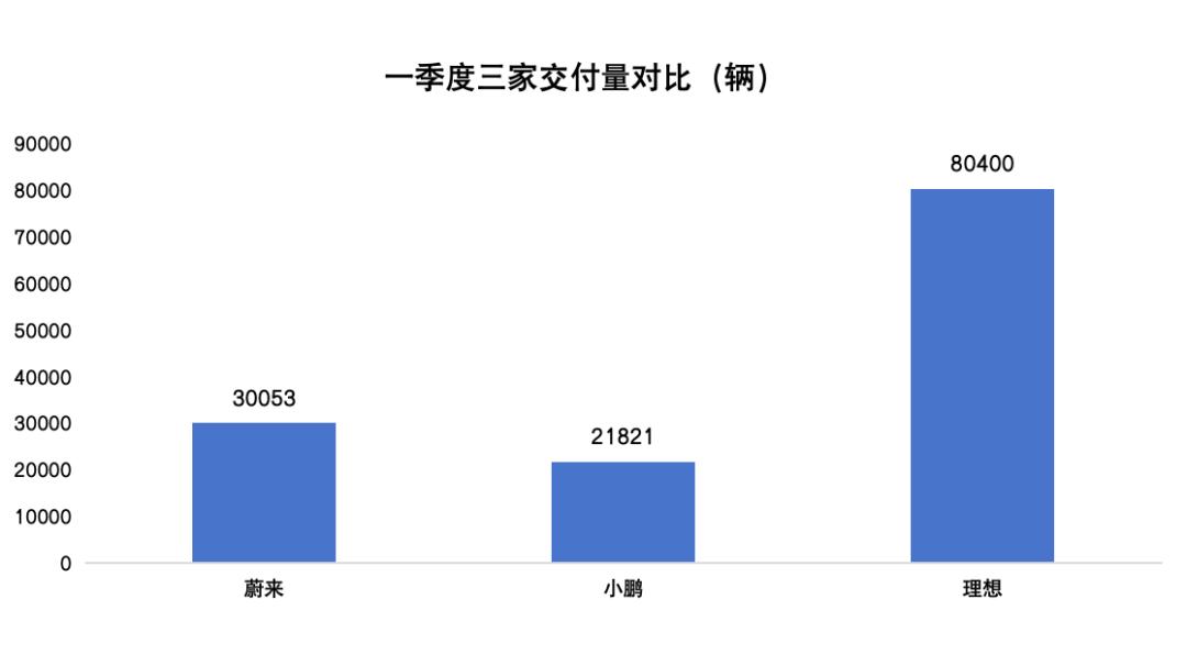 一季度,理想卖出了80400辆车、蔚来卖出了30053辆车、小鹏卖出了21821辆车。