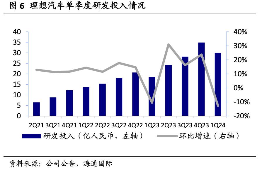 这一点,从理想不断增长的研发投入可见一斑。今年一季度,理想的研发费用为人民币30亿元,同比增加了64.6%,同期小鹏的研发开支为13.5亿元、蔚来为28.64亿元。