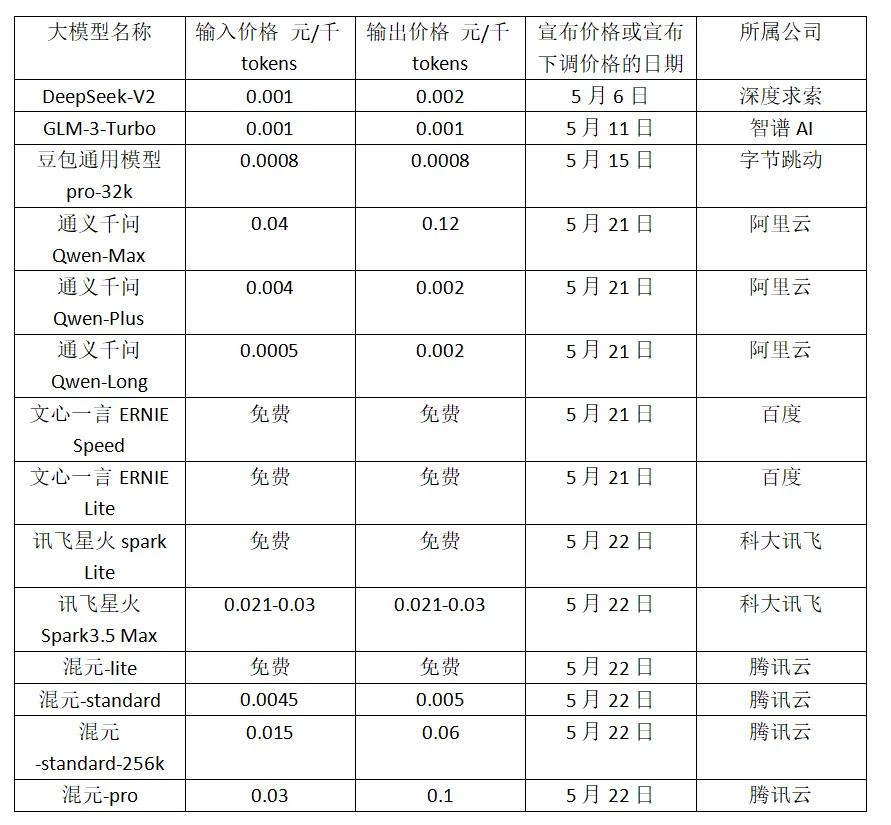五月初开始,9家发布新内容的国内大模型企业中,有7家宣布降价。其中包括:深度求索、智谱AI、字节跳动、阿里云、百度、科大讯飞、腾讯云这7家企业,共涉及21款模型。甚至于有大厂打出“免费模式”的旗号。