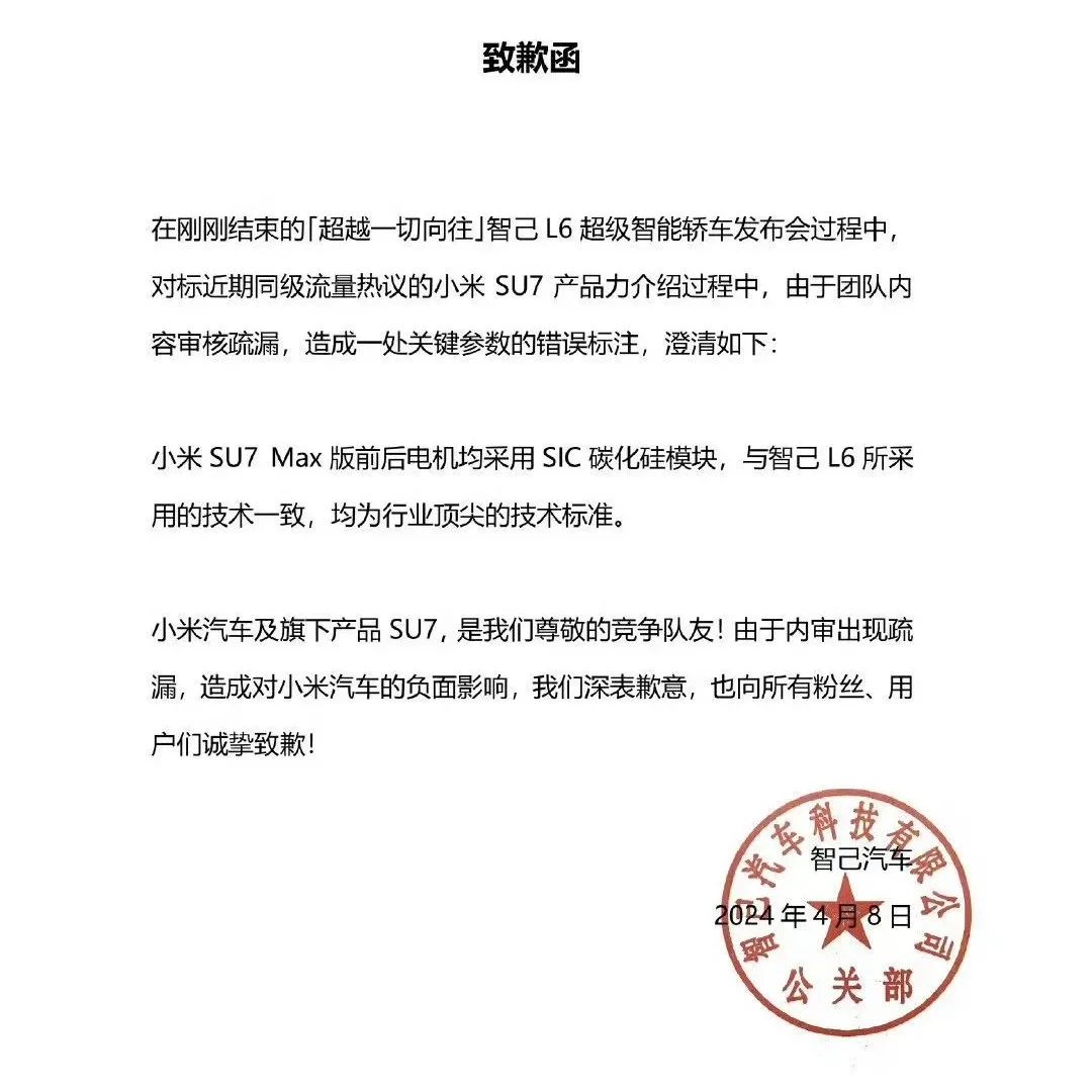 4月,在智己L6的首次发布会上,刘涛频频提及小米SU7,希望借助后者流量打开市场,甚至直接公开在会上对比两款车型参数,不料却标错小米SU7关键参数,引发公关危机。