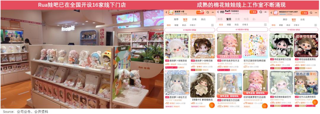 以“正规军”为例,Rua娃吧、是胡萝卜呀、你好岛等品牌正通过IP联名等方式,批量贩卖制成品的棉花娃娃,企图成为娃圈的“泡泡玛特”。