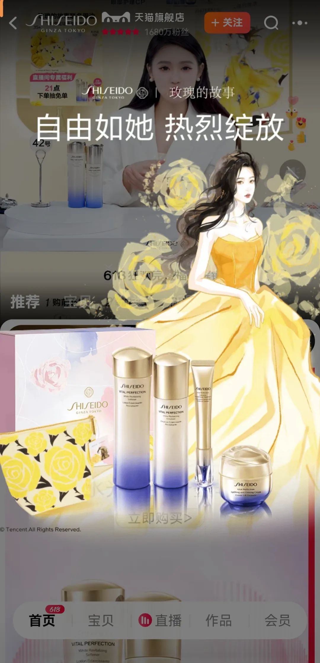 资生堂旗舰店打造《玫瑰的故事》主题618直播间,开屏广告也引入了IP形象。此次与《玫瑰的故事》联名的眼霜目前累计付款达到2万+。