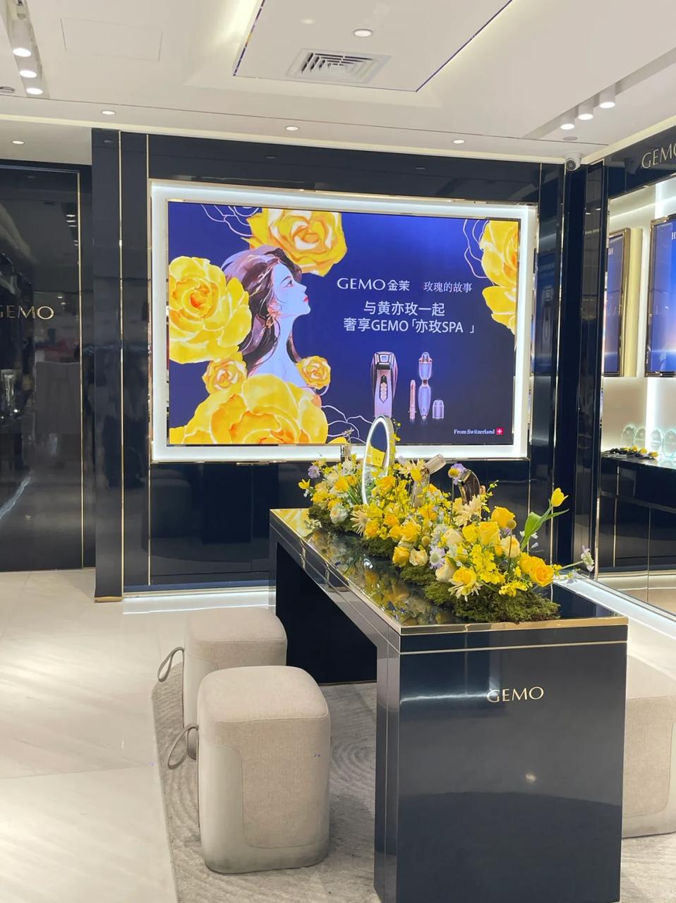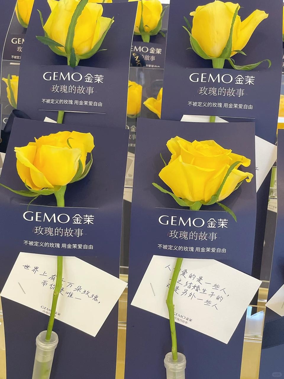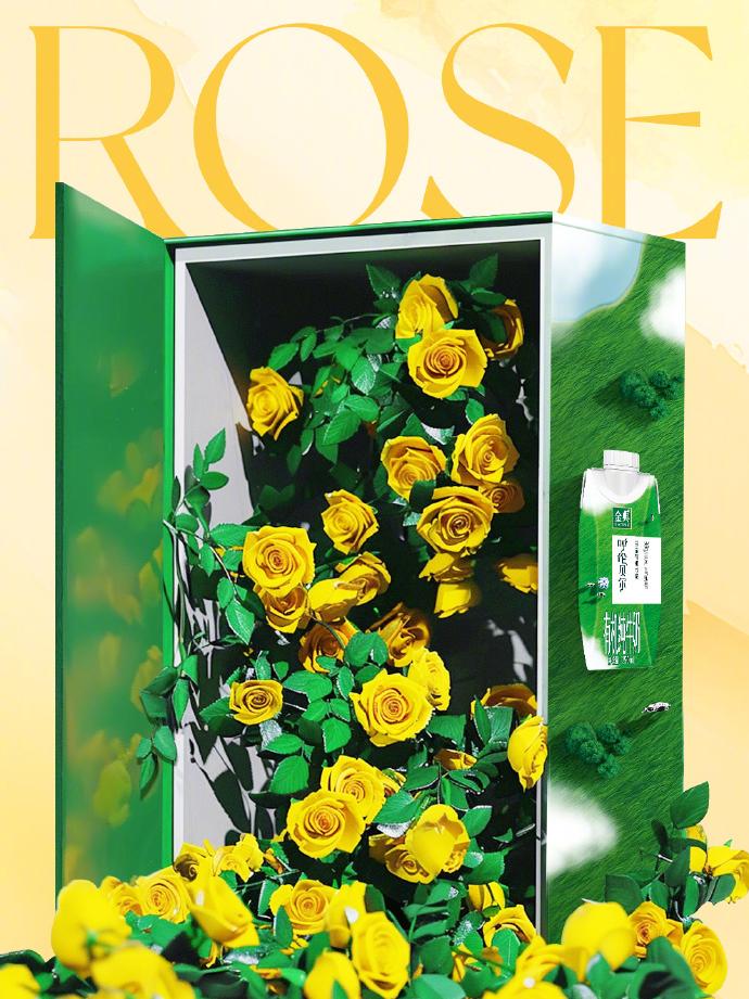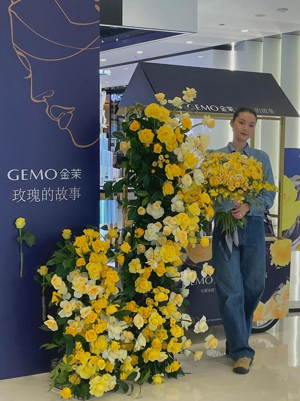 大热IP联名的玩法也是比较多样的,除了常规推出联名礼盒,送周边,还可以设置线下打卡,比如金茉就给门店来了个大改造,主视觉全部换成蓝色和黄色,不仅展台上插满了黄玫瑰,商场里还有一整面黄玫瑰花墙,玫瑰花上还有剧中经典金句。