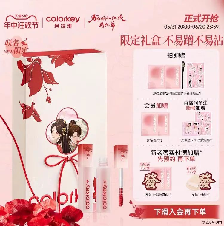 与《狐妖小红娘月红篇》联名的众多品牌则通过代言人营销,专属礼盒,重塑618节点“人货场”价值链,同时推进种草——拔草后链路转化。珂拉琪就将大促和剧集结合得很到位,不仅推出了“狐妖限定”和“狐妖新色”等限定产品和礼盒,还参与了618满减活动和福利赠礼。