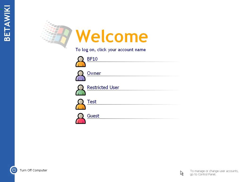启动界面也抛弃了前代 Windows 2000 的机械进度条样式和 Win95 式的加载条,新设计不断涌现:Beta 1 采用了点状加载条;Beta 2 则用上了经典四色加载条,显得更为活泼(个人最喜欢的 Windows 启动界面之一,可惜并未出现在正式版中)。