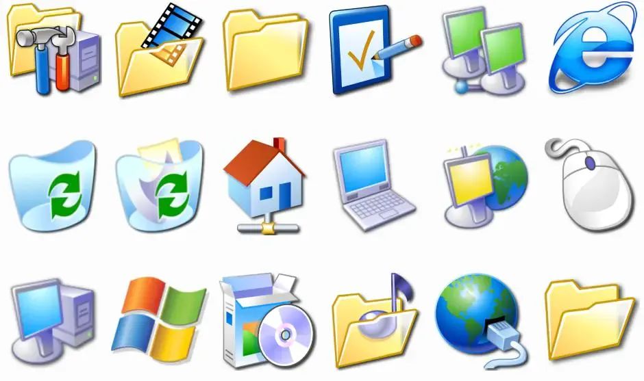 与主题相适应,系统内部的图标也经过了重新设计。新图标采用 48×48 像素,以 32 位颜色呈现,并提供 8 位透明度。与前代相比 Windows XP 的图标绘制得更细致,有着全新的光影效果,色彩也更为丰富亮丽。但也正如 Marcin Wichary 在文章 《一千平方像素的画布》 所言,许多图标采用的颜色过于相近,因此「(颇具讽刺意味的是)就像 Windows 1.0 的情况一样,很难区分一排排看起来相似的蓝色倾斜形状,尤其是当图标缩小时。」
