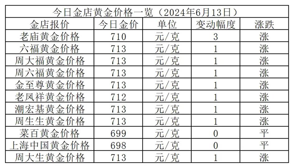 据金投网整理,截至6月13日,各大黄金品牌的金价普遍在713元/克左右。而在2022年6月14日的价格只有513元/克。