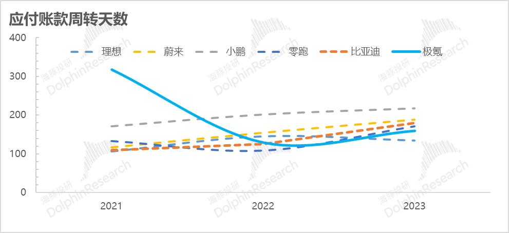 不过从目前的应付账款周转天数(极氪的计算包括应付账款+应付票据+应付关联方款项)来看,除了刚刚起步的2021年,到了2022年和2023年,无论是应付账款增加不够的2022年,还是占用体量加大的2023年,极氪对上游款项的占用时间与同行相比,似乎也都在合理的波动区间内。