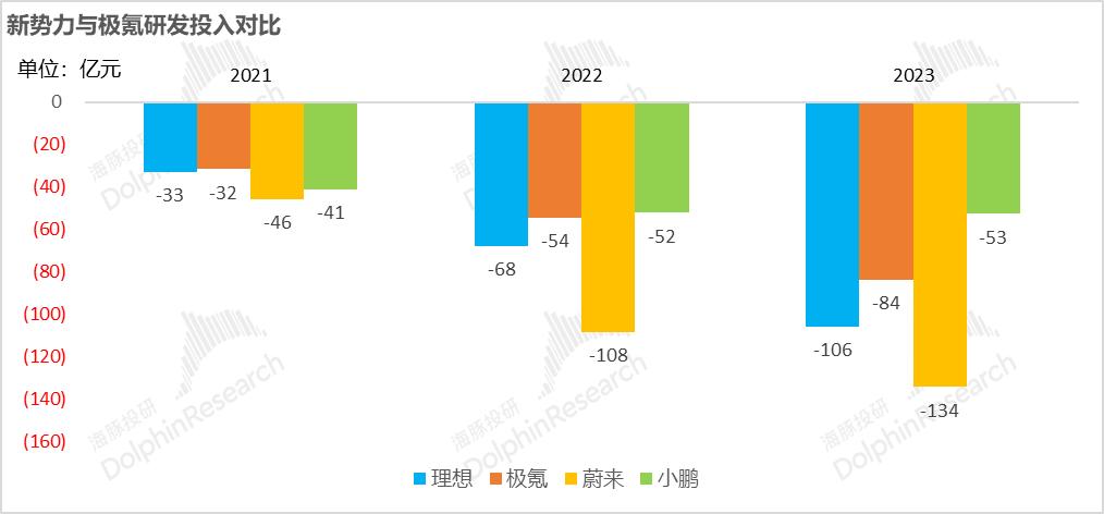 把研发数据扒出来与同行对比之后,海豚君很明显的感受是:极氪与吉利旗下其他公司共享SEA构架的平台费,应该本意是在节省研发投入,但实际效率来看,虽然外包的研发费用没有跟着销量增速等速度提升,但截止一年接近40亿的外包研发费用明显过多。