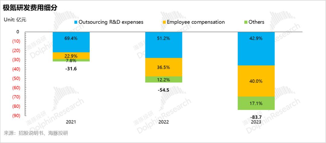 假如说中欧研发中心CEVT和宁波威睿导致它产生研发人员的额外多增,海豚君这里直接把CEVT的700+加上自带工厂的威睿2000人中一半的人算作研发人员,从极氪的总研发人员中剔除,极氪仍有5700多人,在纯电平台外包同时汽车智能化研发偏弱的情况下,这个研发人员数量明显偏多,或者说产出效率不高,研发费用可能仍处于前置性投入阶段。