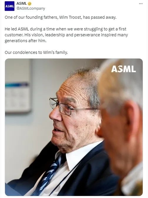 阿斯麦官方账号发文称:“我们的创始之父之一,维姆·特罗斯特去世了。他带领ASML努力争取其第一个客户。他的远见卓识、领导才能和毅力鼓舞了后世多代人。我们向特罗斯特的家人表示哀悼。”