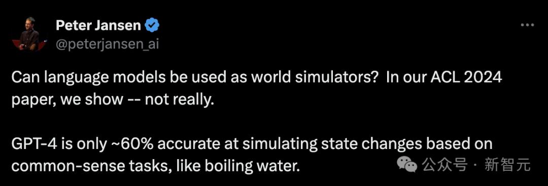 研究发现,GPT-4在模拟基于常识任务的状态变化时,比如烧开水,准确度仅有60%。