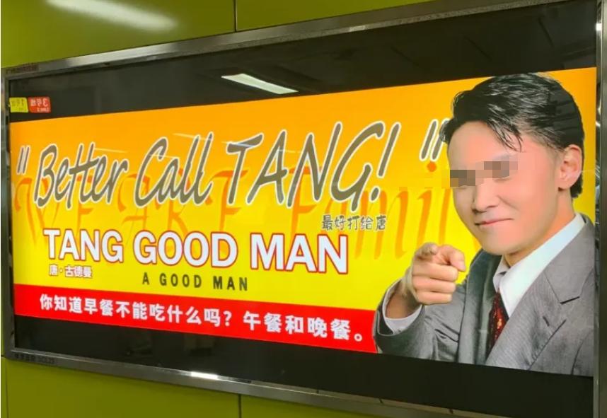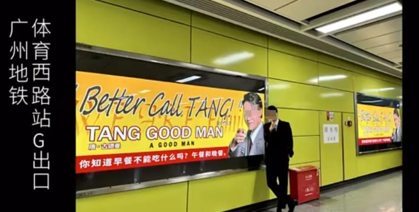 最魔性的当属广州体育西路站这一块,模仿了《风骚律师》里索尔最标志性的宣传海报。