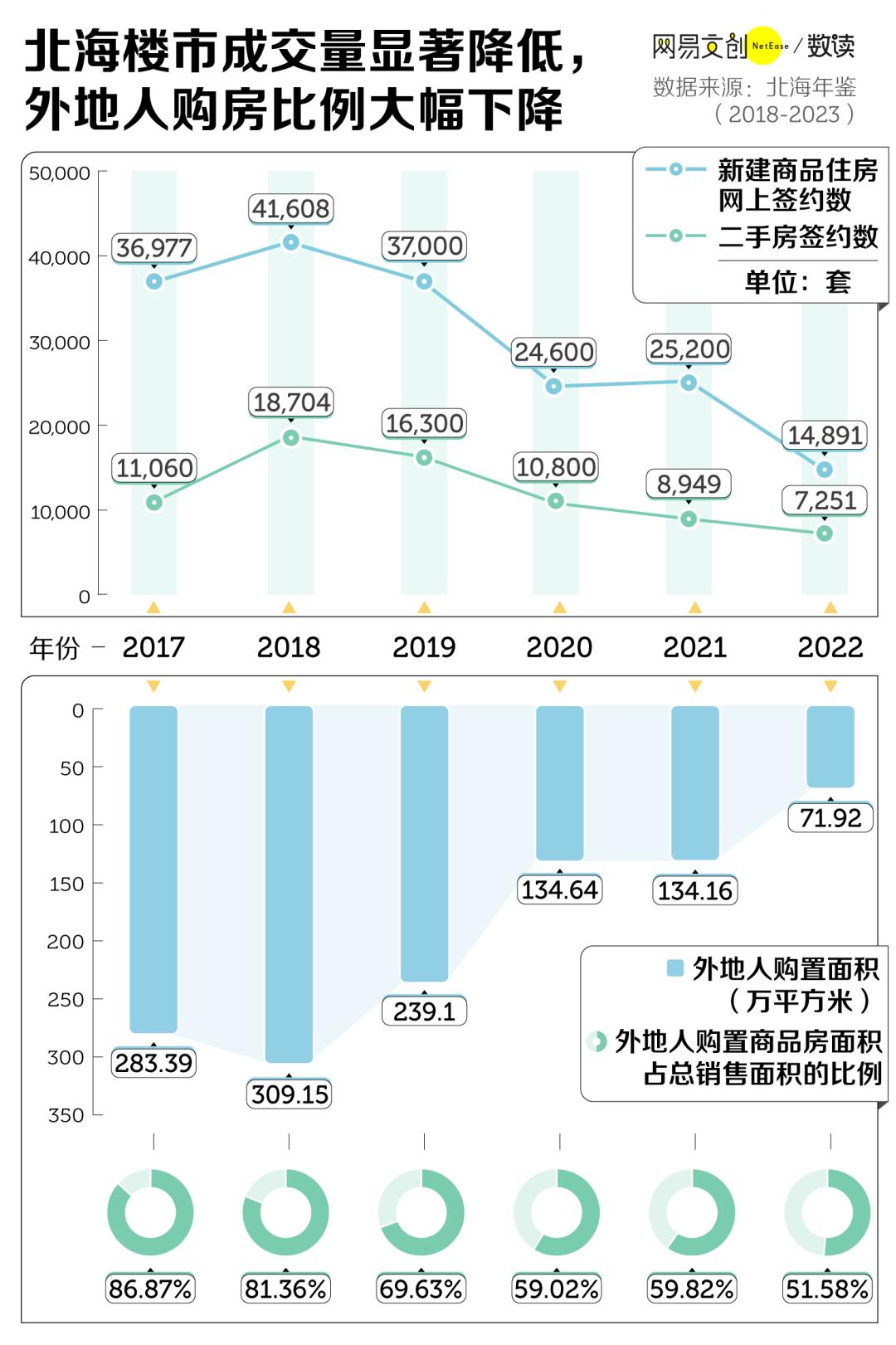 但到了 2022 年,北海外地人的购房面积降到了 71.92 万平方米,不到 2018 年的四分之一,购房面积占总销售面积的比例也下降到了 51.58%。