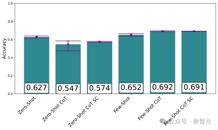 在语言理解MMLU基准测试中,带有示例的提示取得了最佳效果,尤其是与CoT结合时