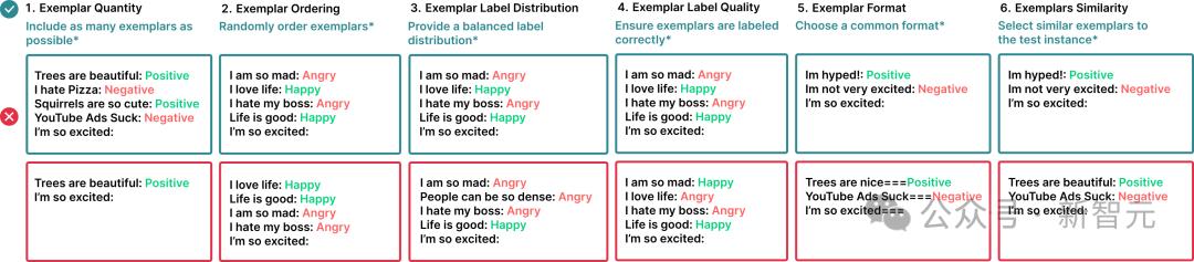 作者总结了在设计少样本提示时的六个主要设计决策,如下图所示。