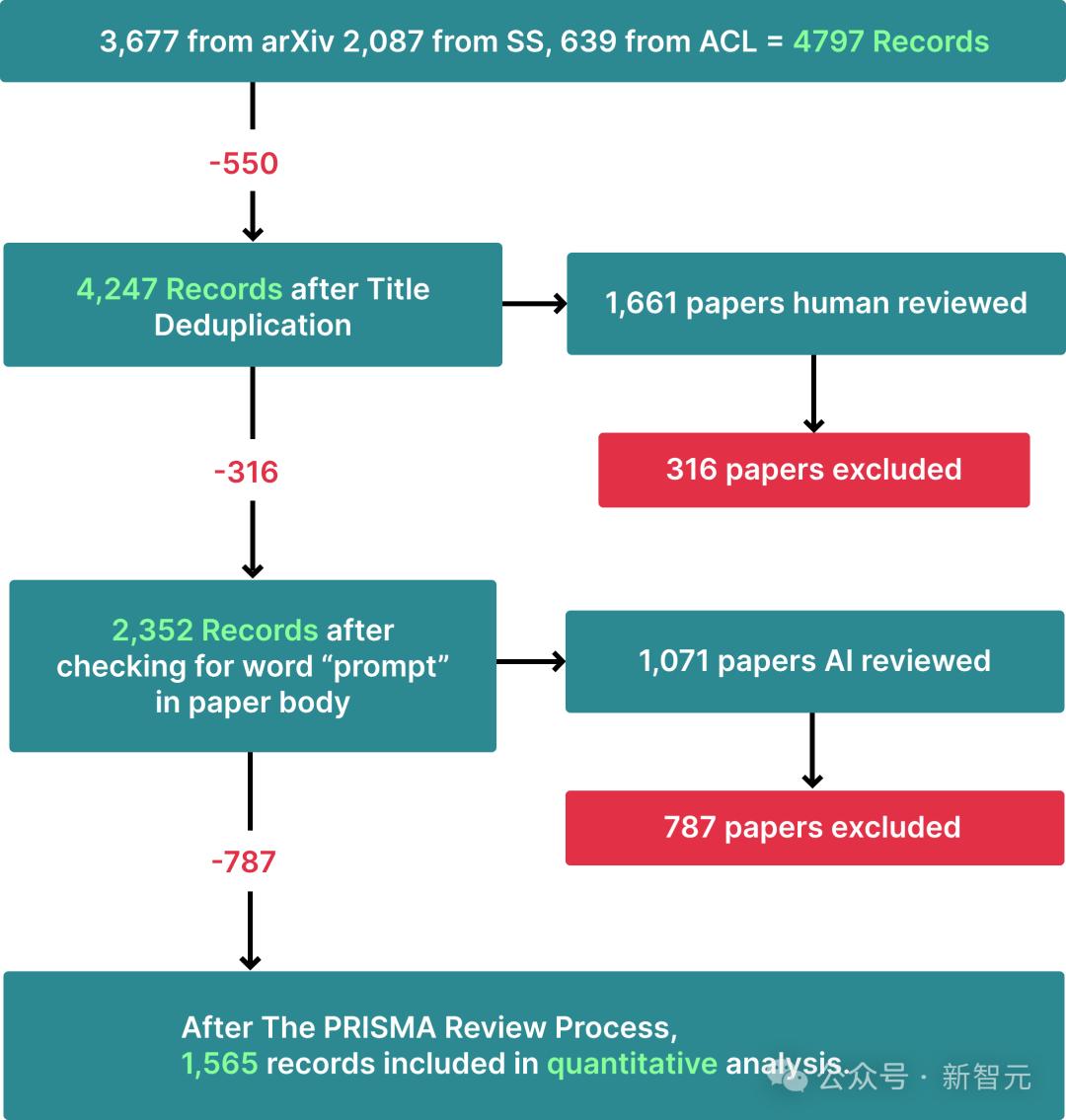然后,根据论文标题进行去重,通过人类和AI审查确定相关性,并通过检查论文正文中是否包含「prompt」一词自动删除不相关的论文。