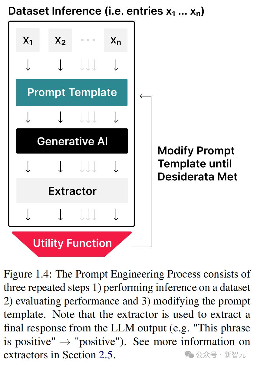 提示工程过程包括三个重复步骤:1)在数据集上进行推理,2)评估性能,3)修改提示模板。