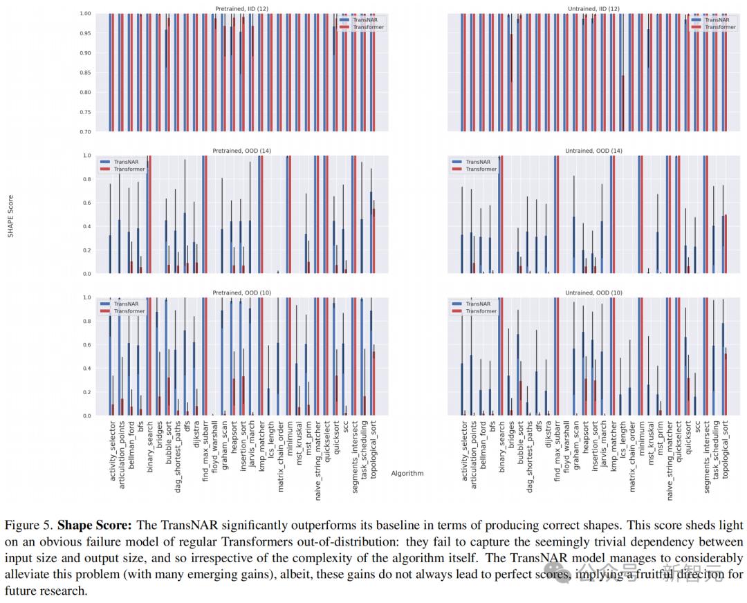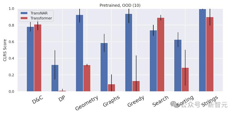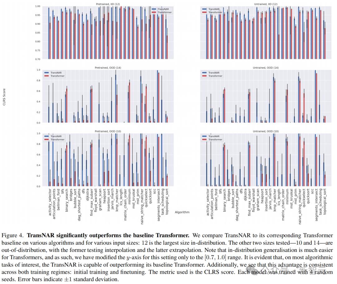 实验结果显示,TransNAR整体上显著优于Transformer模型,在动态规划、几何、图、贪心算法、排序、字符串等任务上的OOD推理能力都有大幅提升。