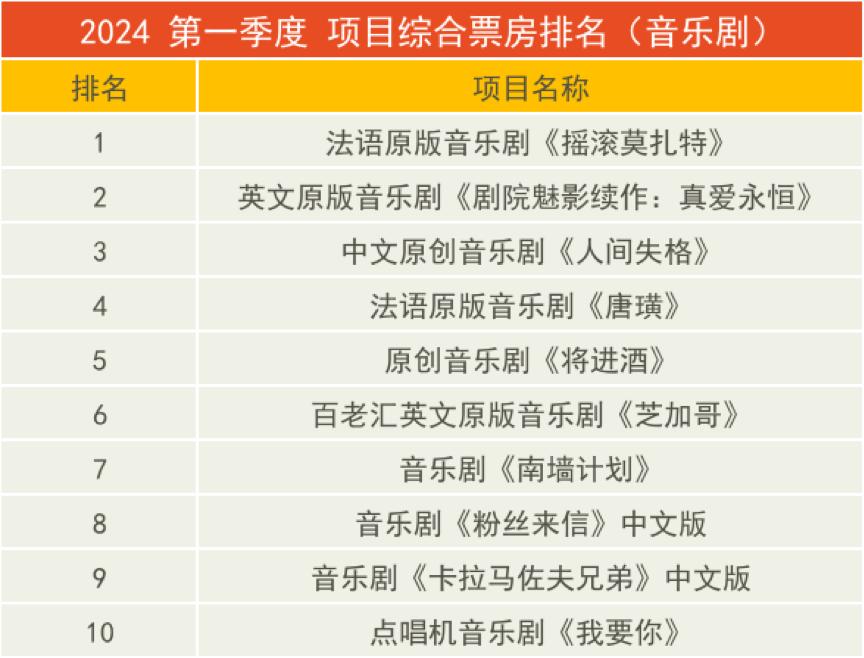保利票务销售数据显示,2024年第一季度综合票房排名前十的音乐剧有“法扎”、“魅影”续集等外语引进版音乐剧,有《粉丝来信》《卡拉马佐夫兄弟》这类的中文版改编剧,还有《人间失格》《将近酒》等本土原创类音乐剧。从票房成绩来看,不管是国外引进项目还是本土原创作品都在蓬勃发展。